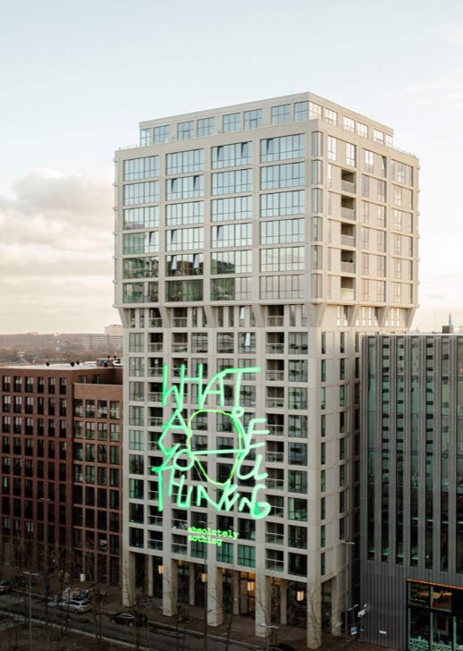 a high-rise building, the work confronts the viewer with a message that is absurd, sincere, and deeply resonant.