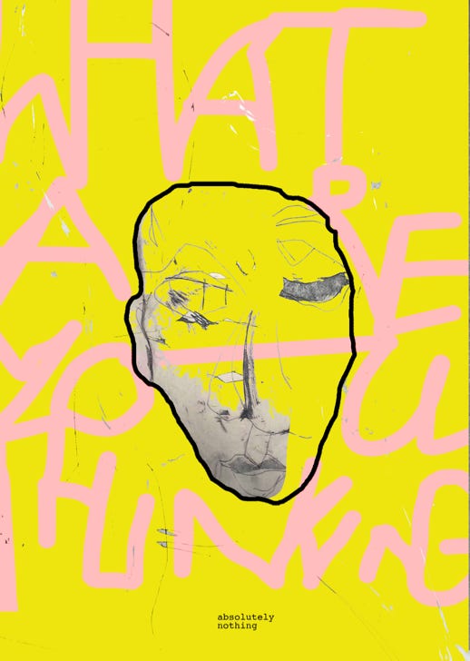 The central phrase — “What are you thinking — absolutely nothing” — refers to the familiar social-media prompt but subverts it with a radically honest answer. In an age defined by overstimulation, information overload, and digital performance, the piece creates a moment of emptiness and pause — one that is both ironic and meaningful.