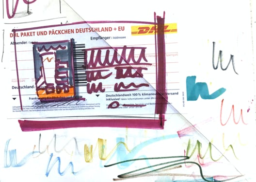 The hand-drawn style deliberately breaks with the visual order of the architectural surface.